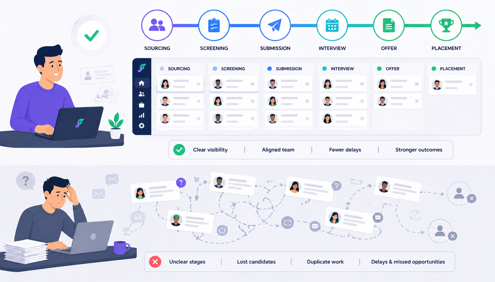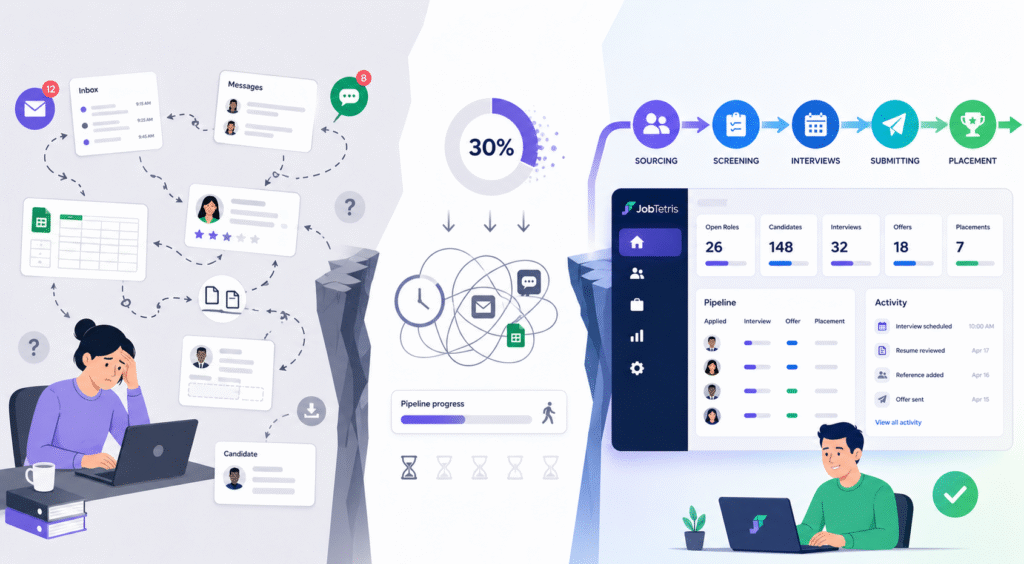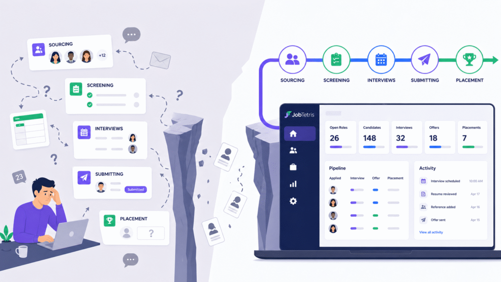 Recruitment is often busy but not always connected. Sourcing candidates, screening, submitting, interviewing, and placing should feel like one continuous flow. Instead, many teams experience disjointed processes where information is lost between stages.