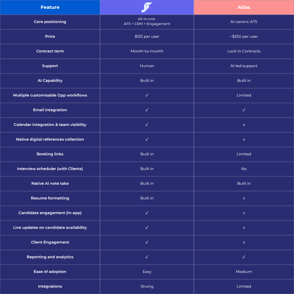 Atlas centres its value around AI infrastructure and workflow automation, but often relies on limited visibility across the broader recruitment lifecycle. JobTetris takes a more practical, end-to-end approach, ensuring that every stage from business development through to placement is connected.