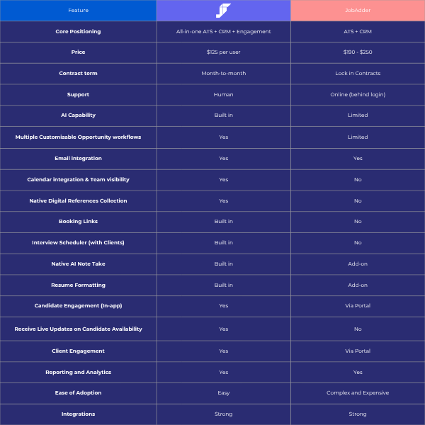 JobTetris is a modern, all-in-one ATS, CRM and engagement platform designed to support growing recruitment agencies. JobAdder remains a more traditional ATS and CRM system with limited native engagement and AI capability.